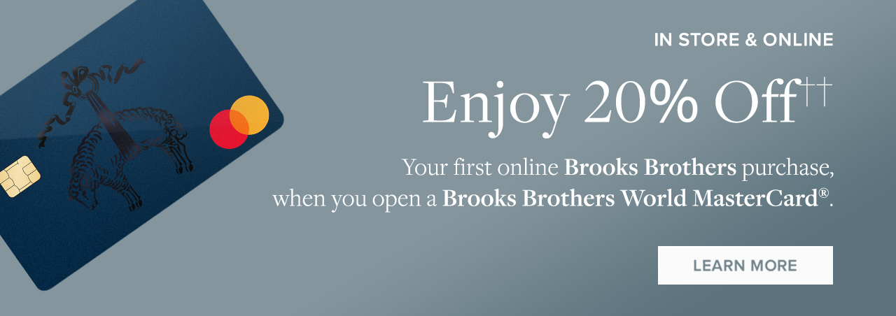 ††Subject to credit approval. Valid for new cardholders only. Discount for opening the Brooks Brothers World Mastercard® account applies to your first purchase only. Limit one Brooks Brothers new account credit card discount per transaction. Discount available at www.brooksbrothers.com. Discount offer not valid in stores. Discount may not be applied to charitable items, gift cards, taxes, shipping and handling, monogramming or engraving, alterations or personalization, or prior purchases. Restrictions apply. See Rewards Terms & Conditions and Credit Program Cardholder Agreement for additional terms and conditions. Discount valid for 30 days after account opening.