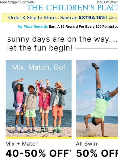 Valid April 21 – May 15, 2025. Valid in U.S. and Puerto Rico stores, online at childrensplace.com, gymboree.com and on The Children’s Place, Inc. official mobile apps. Valid on qualifying orders shipped within the U.S. and Puerto Rico. Valid on The Children’s Place, Gymboree, Sugar & Jade and PJ Place branded merchandise. Purchase must total the specified amount or more, net of applicable discounts and before taxes and shipping fees are applied. Valid for one-time use only. Limit one gift coupon per transaction. Gift coupon must be relinquished at time of purchase. Not valid toward purchase of gift cards, previously purchased merchandise, or licensed or third-party branded products. Cannot be redeemed in a closing store, in conjunction with any in-store or online site-wide percentage-off event or on bulk purchases. Gift coupons are not redeemable for cash or merchandise credit and have no cash value. Returns and exchanges subject to discount taken at time of redemption. May not be purchased, duplicated, traded or sold. Only original coupons will be accepted. Valid coupon code must be provided at checkout. Will not be replaced if lost, stolen or corrupted. Internet distribution strictly prohibited. Not valid in conjunction with The Children’s Place associate discount. Cannot be combined with any offer except My Place Rewards Certificates. Use of gift coupon is acceptance of its terms. Offer may be cancelled or modified by The Children’s Place, Inc. at any time. Void where prohibited.