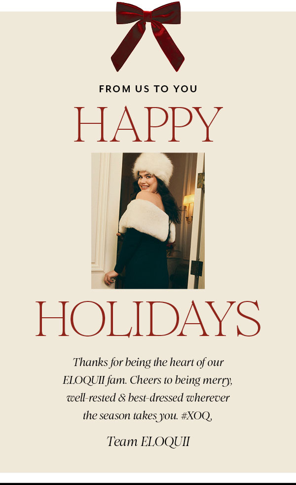 Use code EQFESTIVE to receive 30-50% off select full price merchandise, and an extra 45% off select clearance merchandise. Discount is priced as marked in checkout and only applies to in-stock ELOQUII, ELOQUII Elements, and ELOQUII Studio merchandise. Not applicable to gift cards or prior purchases. May not be redeemed for cash or combined with other offers. Valid online only. Does not apply to Final Sale, Bridal by ELOQUII, CUUP, and select Third Party Merchandise. Additional exclusions may apply. Returns will be credited at the discounted price. All items marked as final sale cannot be returned or exchanged. All promotions and savings are stated in USD. Expires 12/24/2025.