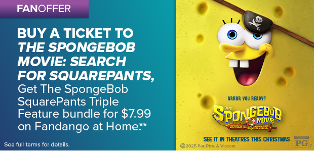 **Limited time offer. Log into your account on Fandango.com or the Fandango app and purchase, between 12:01am PT on 11/24/25 and 11:59pm PT on 12/26/25, at least one movie ticket to ‘The SpongeBob Movie: Search for SquarePants'. Purchaser will receive a post-purchase email containing 1 Fandango at Home Promotional Code (“Code”) that is good for the purchase (and not the rental) of The SpongeBob SquarePants Triple Feature bundle for $7.99 in My Offers in your account on http://fandangoathome.com and via participating Fandango at Home apps. You must have, and be logged into, your Fandango account to receive a Code. Fandango is free to join; you must be 18 years of age or older to create a Fandango account. Code expires on (and must be used by) 12/30/25 at 11:59pm PT. Limit one per transaction. You may have to pay taxes additionally. One-time use only. Void where prohibited. If lost or stolen, cannot be replaced. Offer is non-transferable and cannot be combined with any other offer or discount. No cash value, except as required by law. Not for resale; void if sold or exchanged. Offer valid in the U.S. only (excluding U.S. territories and where prohibited by law). You must have a Fandango at Home account to redeem your Code on Fandango at Home. Fandango at Home is free to join; you must be 18 years of age or older to open a Fandango at Home account. Credit card may be required for transactions on http://fandangoathome.com. Fandango reserves the right to modify or cancel this offer at any time and without notice. This offer and redemption of the Code are subject to Fandango Terms and Policies and Privacy Policy at www.fandango.com/terms-and-policies.