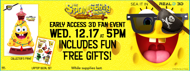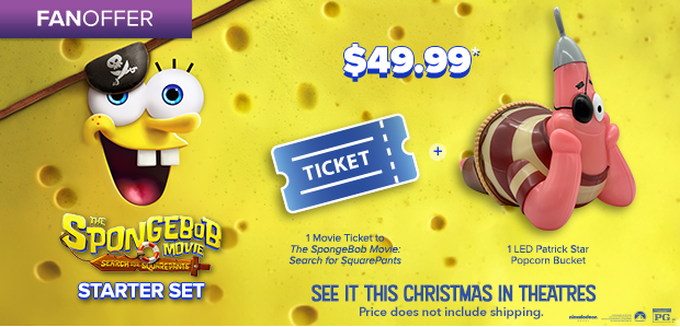 *Search for SquarePants Starter Set is non-refundable. Domestic shipping will be added at checkout. Limited time offer. While supplies last. Movie ticket is non-refundable and non-exchangeable. Fandango reserves the right to modify or cancel this offer at any time and without notice. Popcorn not included. You must be 18 years of age or older to purchase a bundle. The LED Patrick Star Popcorn Bucket will begin shipping in December. Please use a physical U.S. address where the popcorn bucket shipment can be delivered. Once carrier confirms delivery, Fandango is not responsible for lost or stolen deliveries. Valid only in the U.S. and D.C., excluding U.S. territories and where prohibited by law. Not valid with any other offer. See full terms and conditions here.
