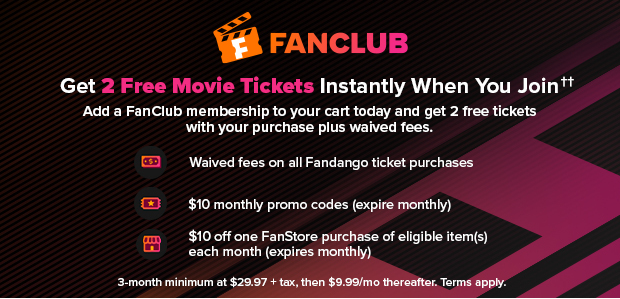 ††The “Join FanClub and Get Up to 2 Free Tickets” offer (the “Offer”) is valid for new Fandango FanClub members only and will run for a limited time. To qualify, you must enroll in a paid Fandango FanClub membership (3-month minimum at $29.97 + tax, then $9.99/month thereafter). If you add a FanClub membership during your Fandango movie ticket purchase, your two free tickets will be delivered instantly at checkout. If you enroll through Fandango.com/fanclub, your two free ticket promo codes will be emailed to you after your 7-day free trial ends and your paid membership begins. Emailed promo codes are valid for two tickets for any movie, in any format, at any theater, at any time of day, are for one-time use, cannot be combined with other offers, and expire 30 days from the date they are sent (the specific expiration date will be noted in the Offer email). The Offer is not valid for current FanClub members, is non-transferable, and has no cash value. Adjustments to prior purchases are not permitted. Fandango may withdraw or modify this Offer at any time, in its sole discretion and without notice. Additional terms and conditions apply. See Fandango FanClub Program Terms for details.