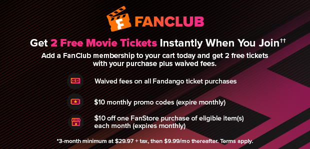 ††The “Join FanClub and Get Up to 2 Free Tickets” offer (the “Offer”) is valid for new Fandango FanClub members only and will run for a limited time. To qualify, you must enroll in a paid Fandango FanClub membership (3-month minimum at $29.97 + tax, then $9.99/month thereafter). If you add a FanClub membership during your Fandango movie ticket purchase, your two free tickets will be delivered instantly at checkout. If you enroll through Fandango.com/fanclub, your two free ticket promo codes will be emailed to you after your 7-day free trial ends and your paid membership begins. Emailed promo codes are valid for two tickets for any movie, in any format, at any theater, at any time of day, are for one-time use, cannot be combined with other offers, and expire 30 days from the date they are sent (the specific expiration date will be noted in the Offer email). The Offer is not valid for current FanClub members, is non-transferable, and has no cash value. Adjustments to prior purchases are not permitted. Fandango may withdraw or modify this Offer at any time, in its sole discretion and without notice. Additional terms and conditions apply. See Fandango FanClub Program Terms for details.