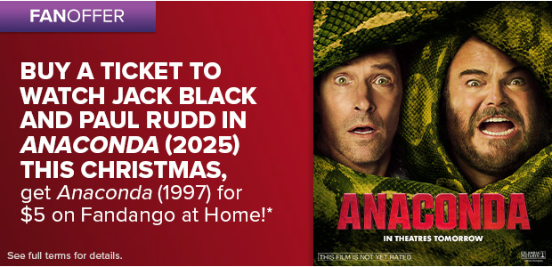 *Limited time offer. Log into your account on Fandango.com or the Fandango app between 12:01am PT on 11/28/25 and 11:59pm PT on 1/16/26 and purchase at least one movie ticket to Anaconda (2025). Purchaser will receive a post-purchase email containing 1 Fandango at Home Promotional Code (“Code”) that is good for the purchase (and not the rental) of the original Anaconda (1997) for $5 in My Offers in your account on http://fandangoathome.com and via participating Fandango at Home apps. You must have, and be logged into, your Fandango account to receive a Code. Fandango is free to join; you must be 18 years of age or older to create a Fandango account. Code expires on (and must be used by) 1/21/26 at 11:59pm PT. Limit one per transaction. You may have to pay taxes additionally. One-time use only. Void where prohibited. If lost or stolen, cannot be replaced. Offer is non-transferable and cannot be combined with any other offer or discount. No cash value, except as required by law. Not for resale; void if sold or exchanged. Offer valid in the U.S. only (excluding U.S. territories and where prohibited by law). You must have a Fandango at Home account to redeem your Code on Fandango at Home. Fandango at Home is free to join; you must be 18 years of age or older to open a Fandango at Home account. Credit card may be required for transactions on http://fandangoathome.com. Fandango reserves the right to modify or cancel this offer at any time and without notice. This offer and redemption of the Code are subject to Fandango Terms and Policies and Privacy Policy at www.fandango.com/terms-and-policies.