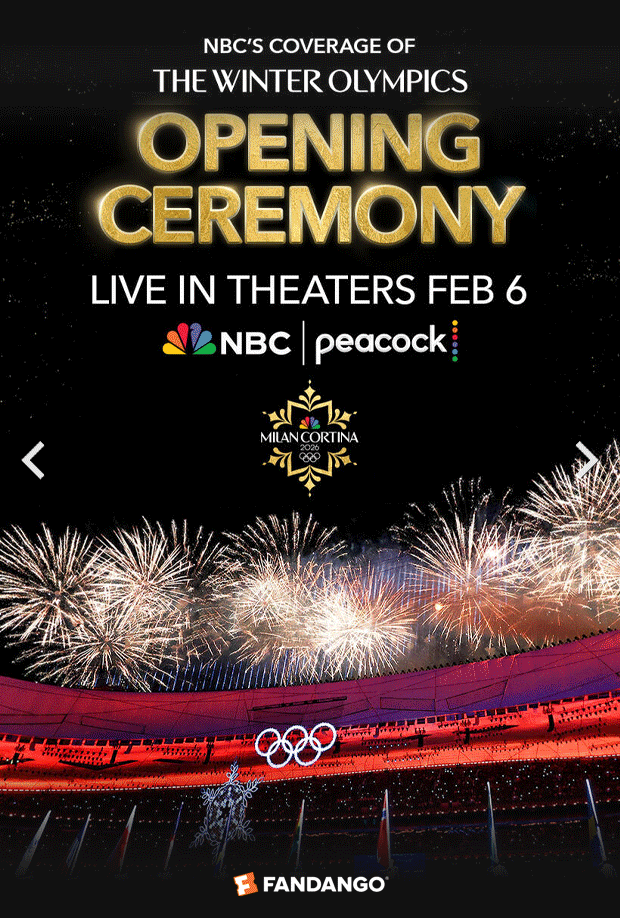 ‡‡Limited time offer. While supplies last. There is a limited quantity of Code redemptions allowed in this promotion. Log into your Fandango account on Fandango.com or via the Fandango app between 1/23/26 and 2/22/26, buy at least one adult ticket to see the Winter Olympics at a participating Fandango theater, and use the Fandango Promotional Code OLYMPICSBOGO ("Code") to get up to $15 off a second ticket (equal or lesser value, up to $15 total ticket price and associated fees and charges) in the same transaction for the same showtime. Code expires, and can no longer be used, upon the earlier of 11:59pm PT on 2/22/26, or the limit of Code redemptions being reached, or the Winter Olympics no longer being available in theaters. One-time use only. Code must be entered at checkout. Only valid for purchase of movie tickets made at Fandango.com or via the Fandango app and cannot be redeemed directly at any theater box office. If cost of additional movie ticket and associated fees and charges is more than Code's maximum discount, then user must pay the difference. Any price difference between total transaction price and Code's maximum discount will not be refunded. You must have, and be logged into, your Fandango account to redeem a Code. Fandango is free to join; you must be 18 years of age or older to create a Fandango account. If lost or stolen, cannot be replaced. No cash value, except as required by law. Void where prohibited. Not valid with any other offer. Offer valid in U.S. only (excluding U.S. territories and where prohibited by law). Non-transferable. Not for resale; void if sold or exchanged. You may have to pay taxes additionally. Limit one Code per person. Fandango reserves the right to modify or cancel this offer at any time and without notice. This offer and redemption of the Code are subject to Fandango’s Terms and Policies at www.fandango.com/terms-and-policies.