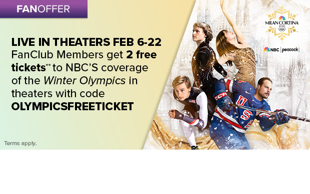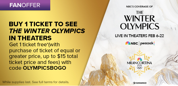 **The “FanClub Members Get 2 Free Tickets Promotion” offer (the “Offer”) will run for a limited time and is available to both existing and new Fandango FanClub members, subject to the terms below. Existing Fandango FanClub members may receive up to two (2) free Winter Olympics 2026 tickets by entering promo code OLYMPICSFREETICKET at checkout during a qualifying purchase of Winter Olympics 2026 tickets on Fandango. Non-members must enroll in a paid Fandango FanClub membership by adding one (1) month of FanClub ($9.99/month + tax) to their cart during checkout of a Winter Olympics 2026 ticket purchase to qualify for the Offer; when FanClub is added to the cart, the Offer will be automatically applied at checkout and no promo code is required. The Offer is non-transferable, has no cash value, and adjustments to prior purchases are not permitted. Fandango reserves the right to withdraw or modify this Offer at any time, in its sole discretion and without notice. Additional terms and conditions apply. See the Fandango FanClub Program Terms for details at https://www.fandango.com/policies/fanclub-terms.