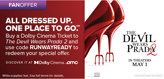 ‡‡‡Limited time offer. While supplies last. There is a limited quantity of Code redemptions allowed in this promotion. Log in to your Fandango account on Fandango.com or via the Fandango app between 3/12/26 and 5/8/26, purchase at least one (1) Dolby Cinema ticket to see The Devil Wears Prada 2, and enter the promotional code RUNWAYREADY (“Code”) to receive $5 off your purchase. Code expires, and can no longer be used, if not redeemed by 5/8/26, or when the limit of Code redemptions is reached, or when The Devil Wears Prada 2 is no longer available in Dolby Cinema theaters, whichever comes first. Code must be entered at checkout. Only valid for purchase of movie tickets made at Fandango.com or via the Fandango app and cannot be redeemed directly at any theater box office. You must have, and be logged into, a Fandango account to redeem the Code on Fandango. Fandango is free to join; you must be 18 years of age or older to create a Fandango account. If cost of movie tickets and associated fees and charges is more than Code’s maximum discount, then user must pay the difference. Any price difference between total transaction price and Code’s maximum discount will not be refunded. One-time use only per transaction. Void where prohibited. Offer is non-transferable and cannot be combined with any other offer or discount. No cash value, except as required by law. Not for resale; void if sold or exchanged. Offer valid in the U.S. only (excluding U.S. territories and where prohibited by law). You may have to pay taxes additionally. Fandango reserves the right to modify or cancel this offer at any time and without notice. This offer and redemption of the Code are subject to Fandango's Terms and Policies and Privacy Policy at http://www.fandango.com/terms-and-policies.