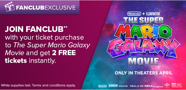 **The ‘The Super Mario Galaxy Movie – 2 free tickets FanClub Promotion' offer (the “Offer”) begins 3/9/26 and will run for a limited time. Offer valid for new FanClub members only. To be eligible, you must subscribe to a 3-month paid FanClub membership ($29.97 + tax, then $9.99 per month thereafter) when purchasing tickets The Super Mario Galaxy Movie on the Fandango website or mobile app, and Offer will be automatically applied at checkout. To redeem the Offer, you must complete checkout while an eligible FanClub membership is in your cart and Offer is applied. Offer valid in the U.S. only (excluding U.S. territories and where prohibited by law); void where prohibited. Adjustments to prior purchases not permitted. Taxes may apply. Offer may only be redeemed once per person. Fandango reserves the right to withdraw or modify this Offer at any time, in its sole discretion, and without notice. Additional terms and conditions apply, including Fandango’s Terms and Policies at www.fandango.com/terms-and-policies.