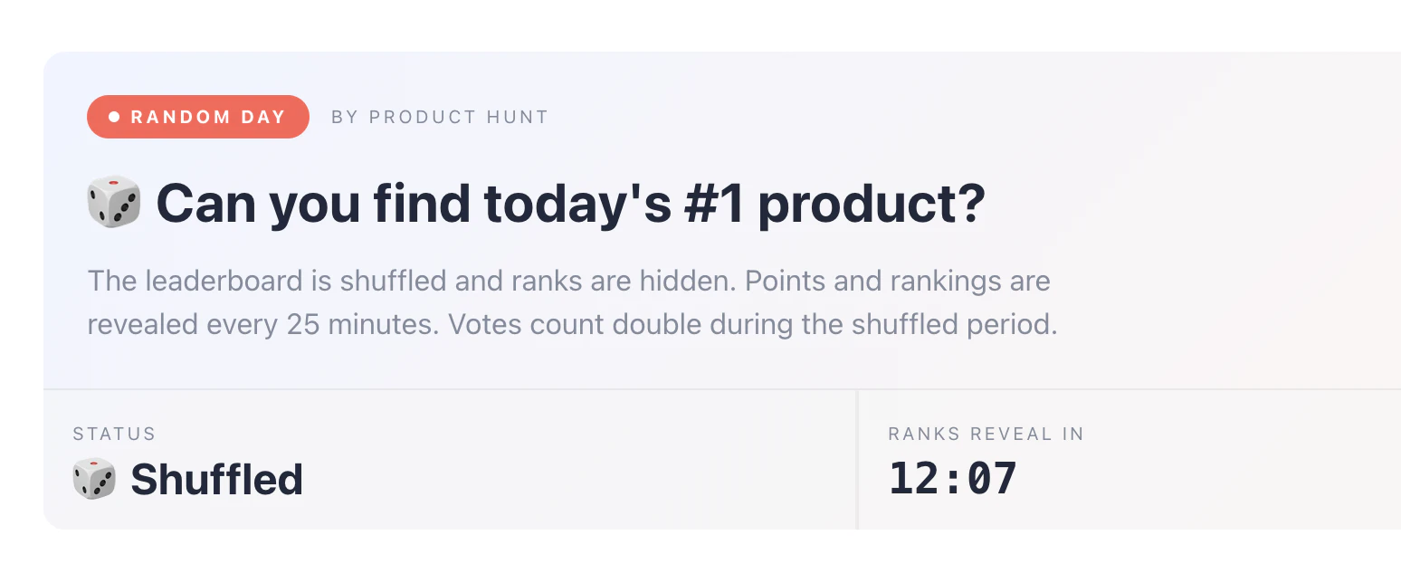 P.S. Today's Random Day on Product Hunt means the leaderboard is getting shuffled all day, so good luck pretending you were not going to keep checking it.