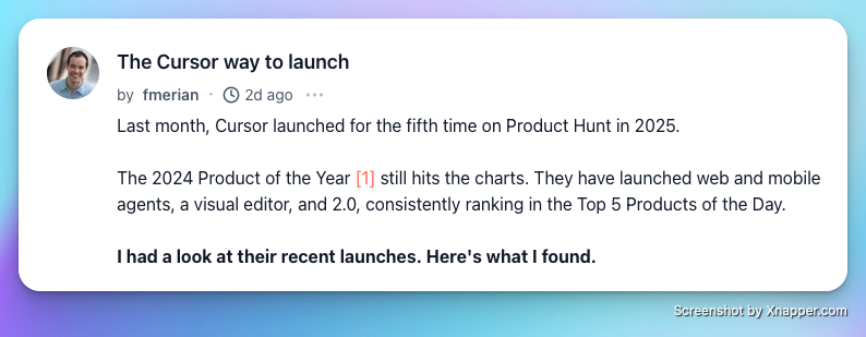 New week, new products and advice. This week: get the secret sauce behind Cursorβs launch successes, learn how Basedash built an AI agent to 10x its product activation rate, check out the Claude Cowork beta, and stick around for 5 of our favorite launches.