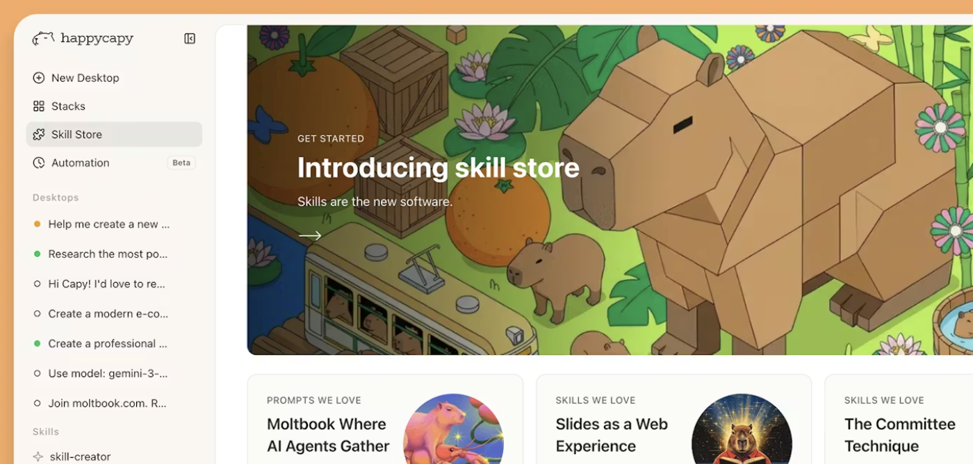 Happycapy runs Claude Code in a sandboxed workspace inside your browser and on your phone. You open a tab, get a visual desktop for agents, and let them handle coding, design, docs, and small workflows without setting up servers or local hardware. It is built by the original Trickle team and tries to make agent stuff usable for people who do not want to touch infra at all.