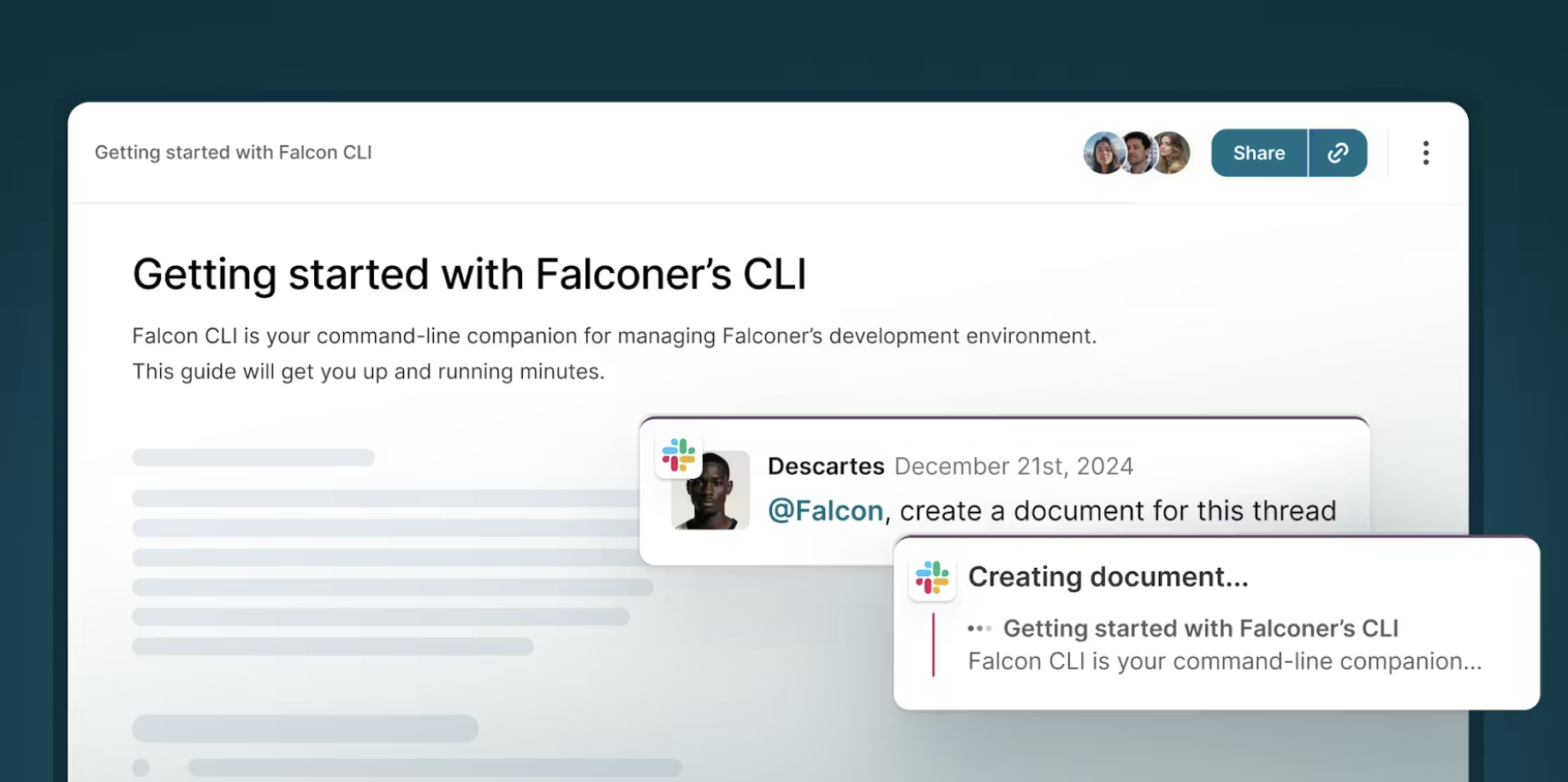 Falconer is a shared memory layer for fast moving engineering teams. It connects to GitHub, Slack, Linear, and your docs, then turns code, PRs, and threads into living documentation you can search. You can ask what changed, why a decision was made, spin up onboarding guides or changelogs from real history, and it keeps docs in sync when the code moves.