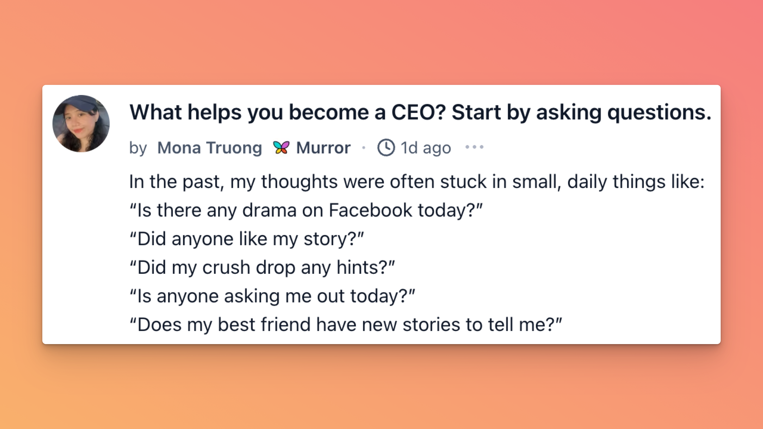 Mona Truong shared how her brain used to be stuck on tiny dramas, likes, stories, crushes, who texted back, until she hit the βI donβt even know who I amβ wall and started asking bigger questions instead.