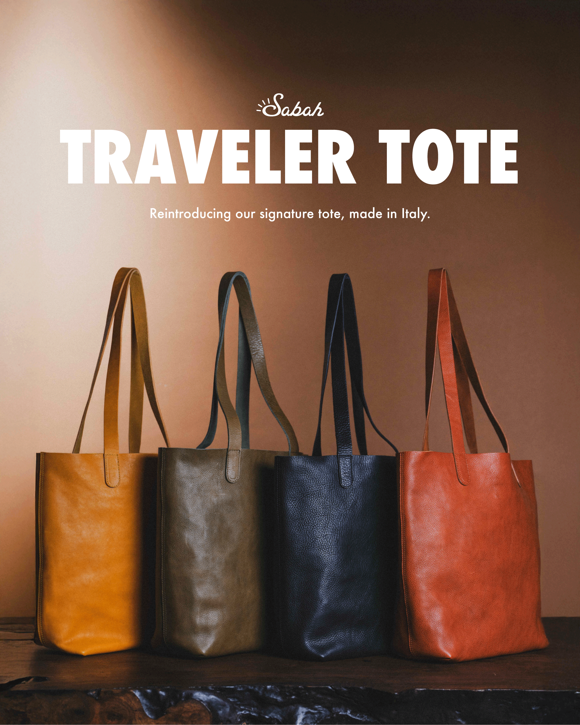 Today marks the return of our Sabah Traveler Tote, made with an exquisite soft yet robust 100% vegetable-tanned Italian leather and produced in a small workshop in Casette d'Ete, Italy that's celebrated for its mastery of small leather goods.