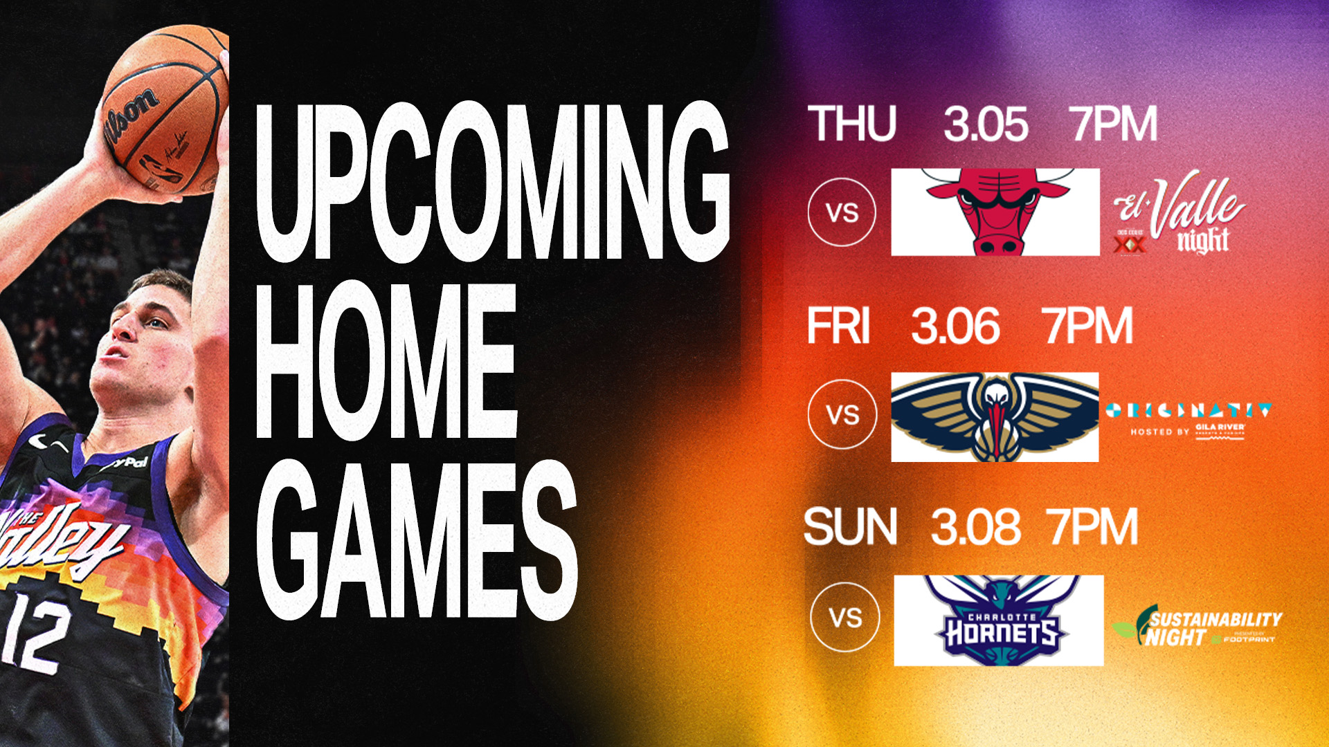 March 5 | 7:00pm MST | vs. Chicago Bulls El Valle Night, presented by Dos Equis *First 5,000 fans in attendance (21+) will receive a free bandana, courtesy of Dos Equis* WATCH: ARIZONA'S FAMILY 3TV / ARIZONA'S FAMILY SPORTS (Pregame coverage begins at 6:30pm MST on Arizona's Family 3TV & Arizona's Family Sports) STREAM: SUNS+ LISTEN: KMVP 98.7 / S: KSUN |