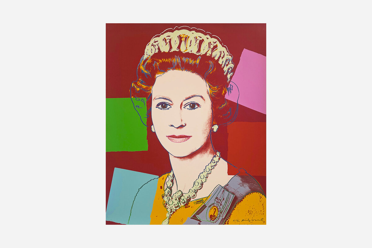 A diamond dust-treated, hand-numbered edition of Andy Warhol's Queen Elizabeth II is up for auction. $200,000+.