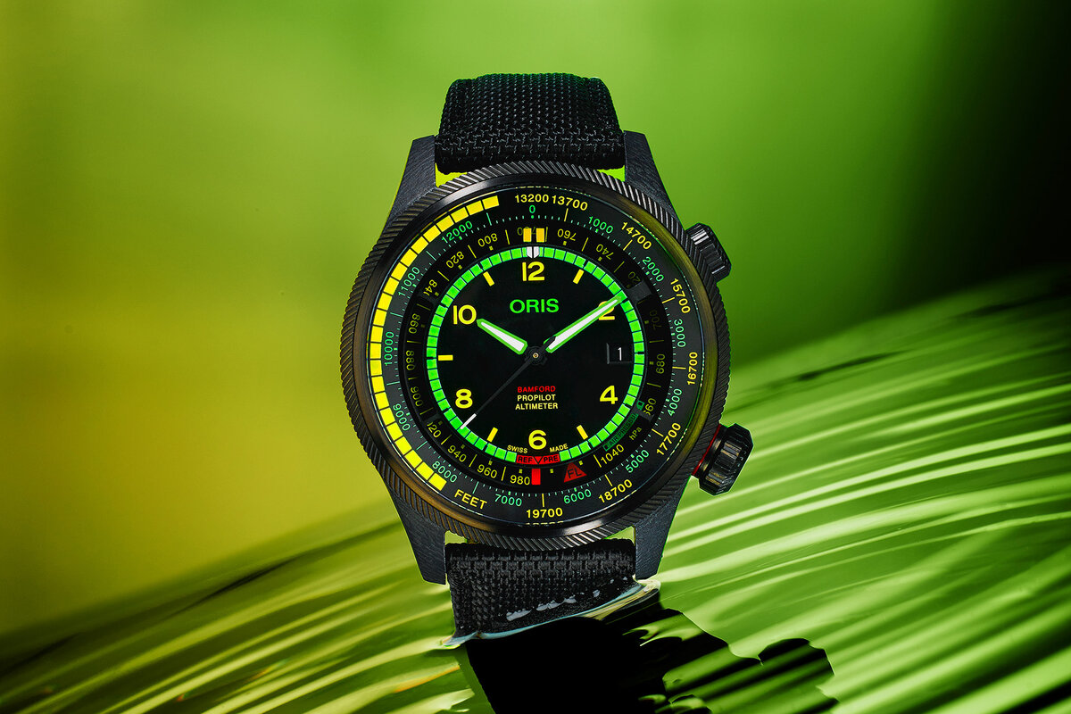 Bamford Watch Department gives the Oris ProPilot Altimeter a high-vis makeover with this timepiece. $8,100.
