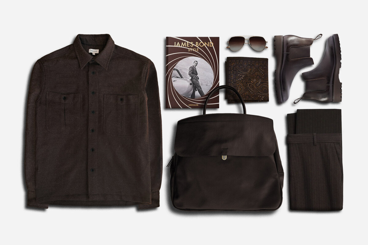 James Bond Style book inspires this chocolate-brown outfit with John Lobb boots and aviators.