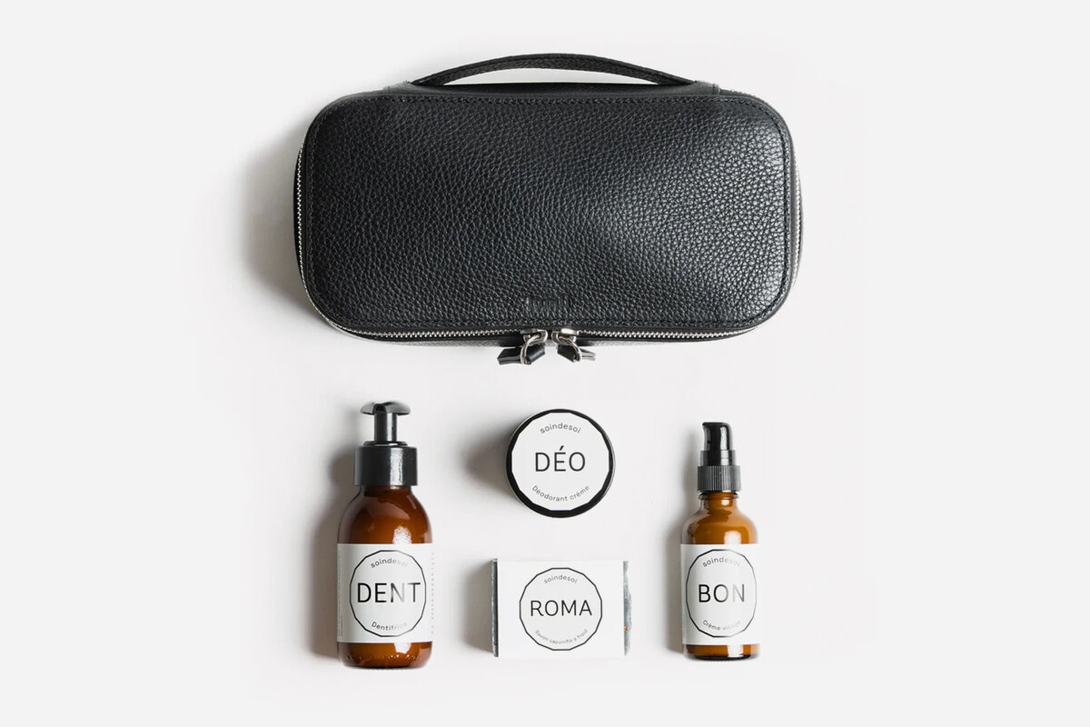 A refined leather toiletry case meets a curated set of organic daily essentials. $264. Presented by Lundi.