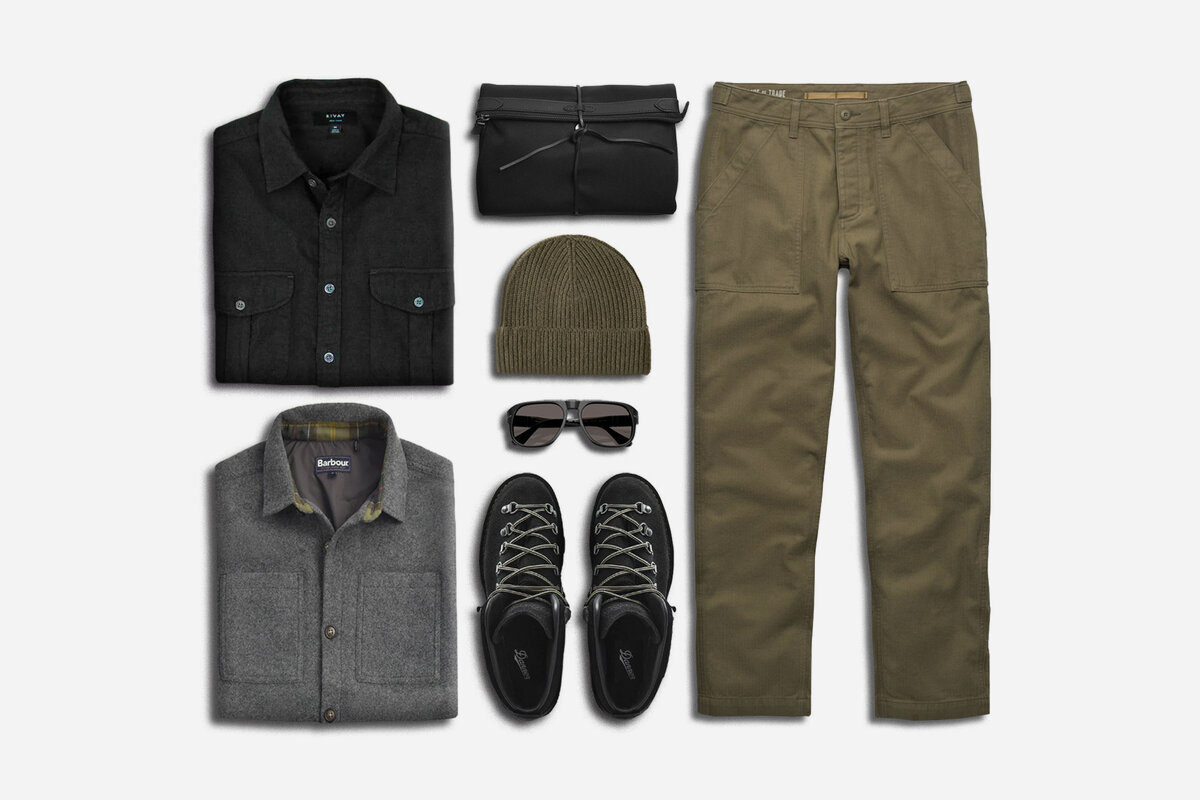 Danner Black boots anchor this adventure-ready outfit with olive layers and Barbour wool.