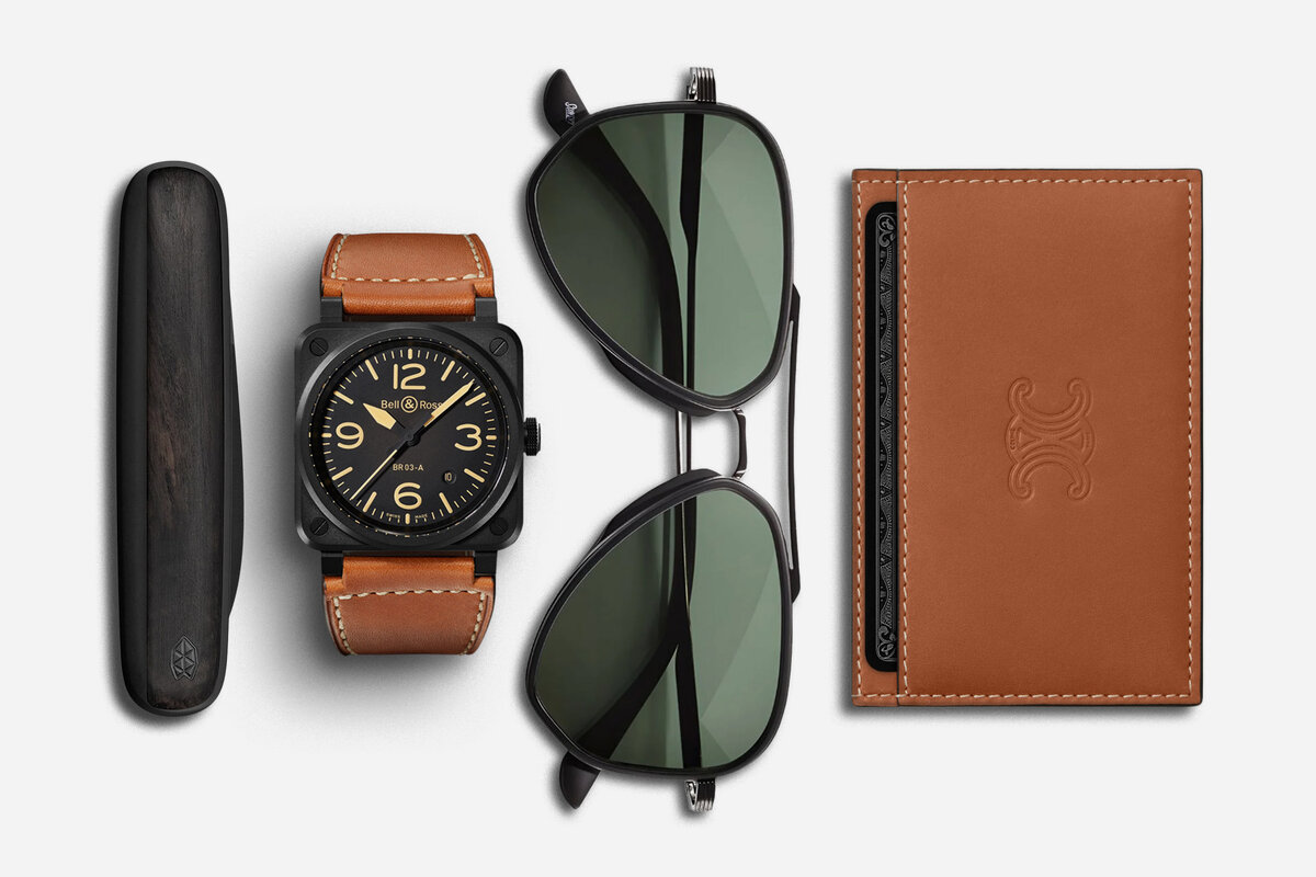 A pair of aviator-style sunglasses leads this graphite and tan collection of knife, watch, and wallet.