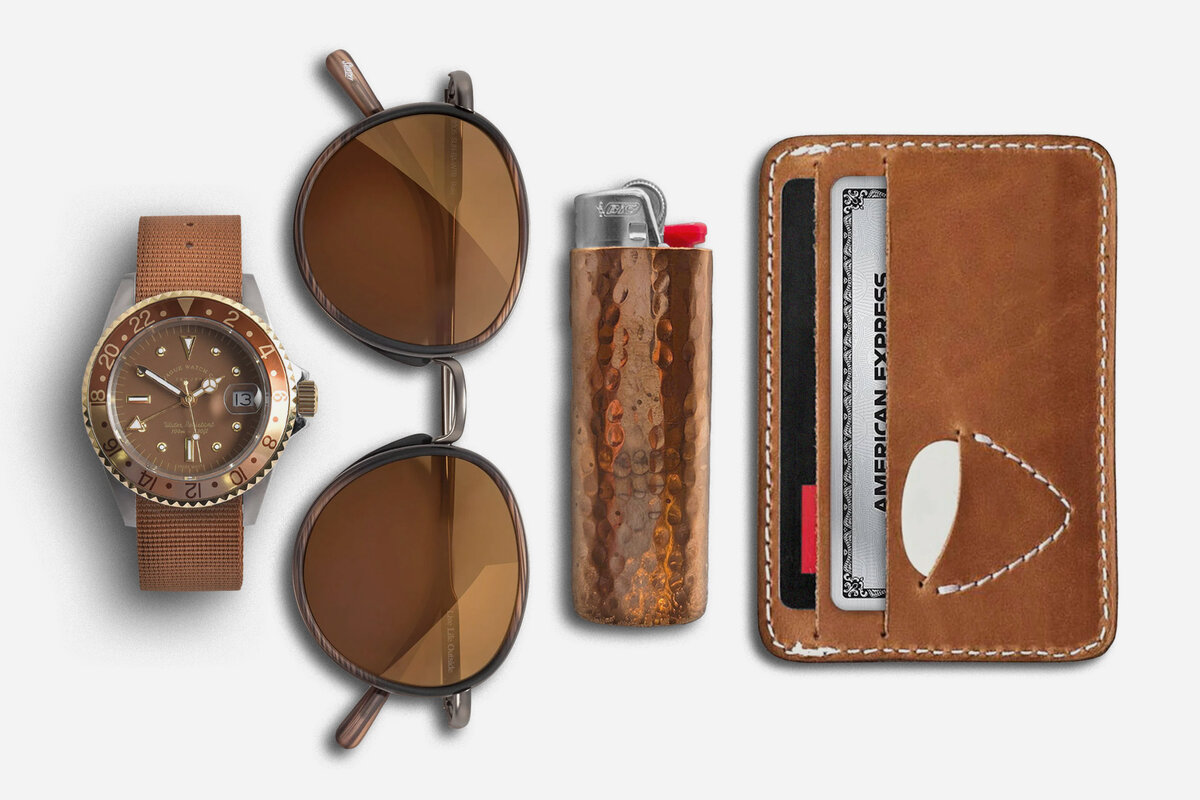 A solid brass lighter cover leads this similarly-hued set of watch, sunglasses, and cardholder.