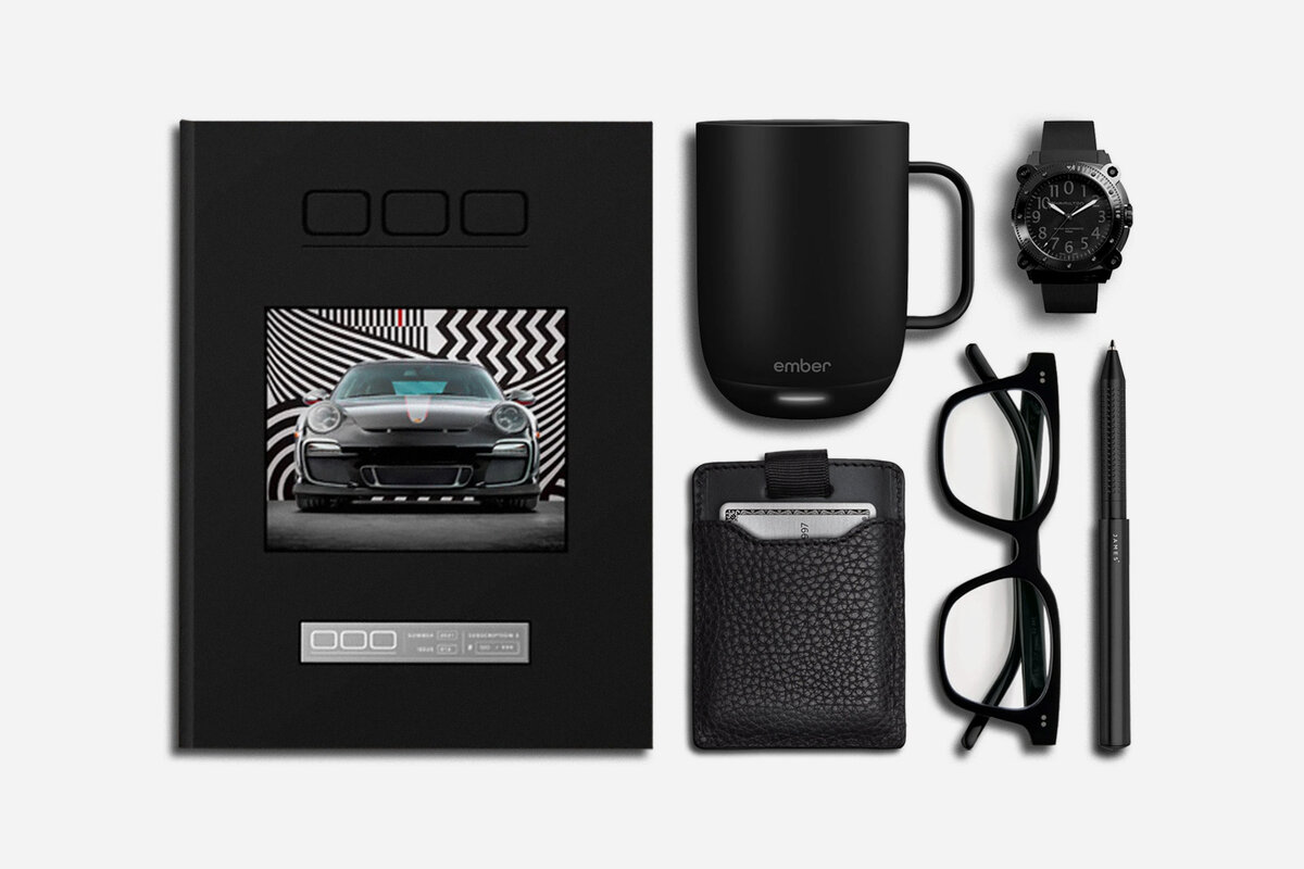 A Porsche-focused magazine leads off this well-heeled set of mug, wallet, watch, glasses, and pen. Presented by OOO Magazine.