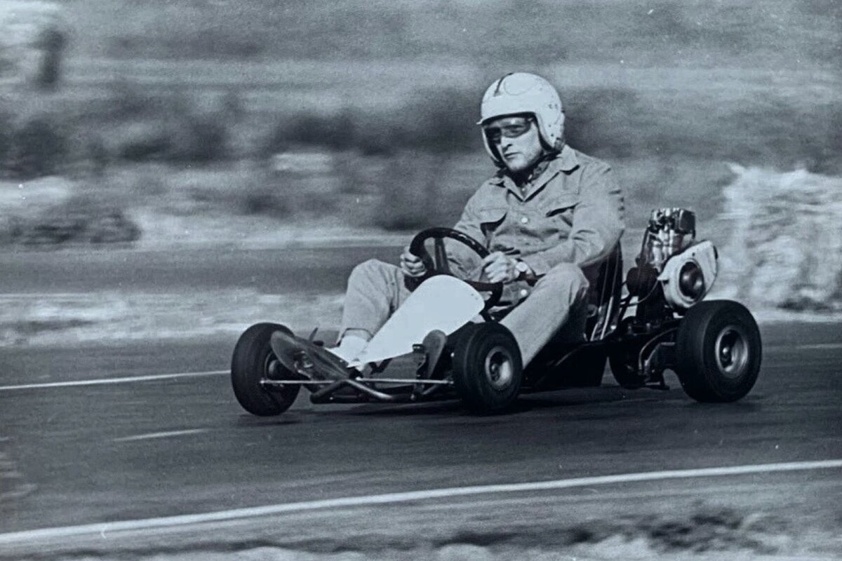 A 1962 press photo of Newman on a go-kart. He'd finish second at Le Mans seventeen years later. $79.